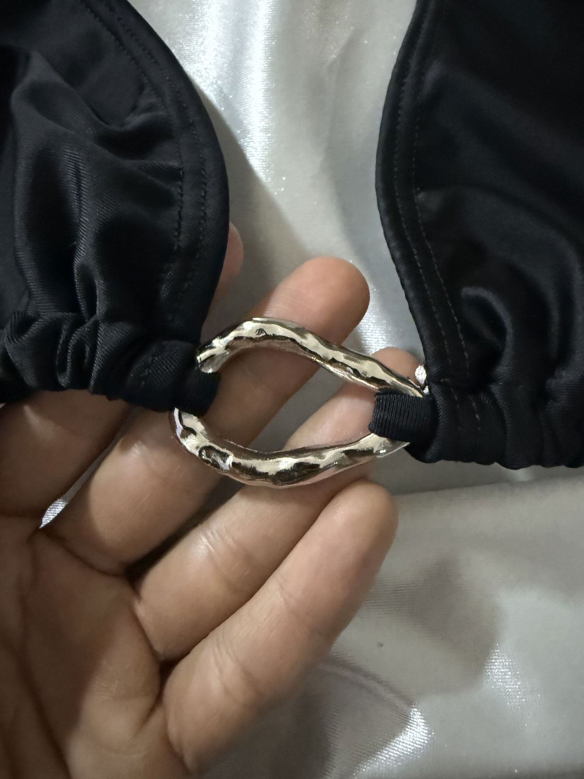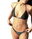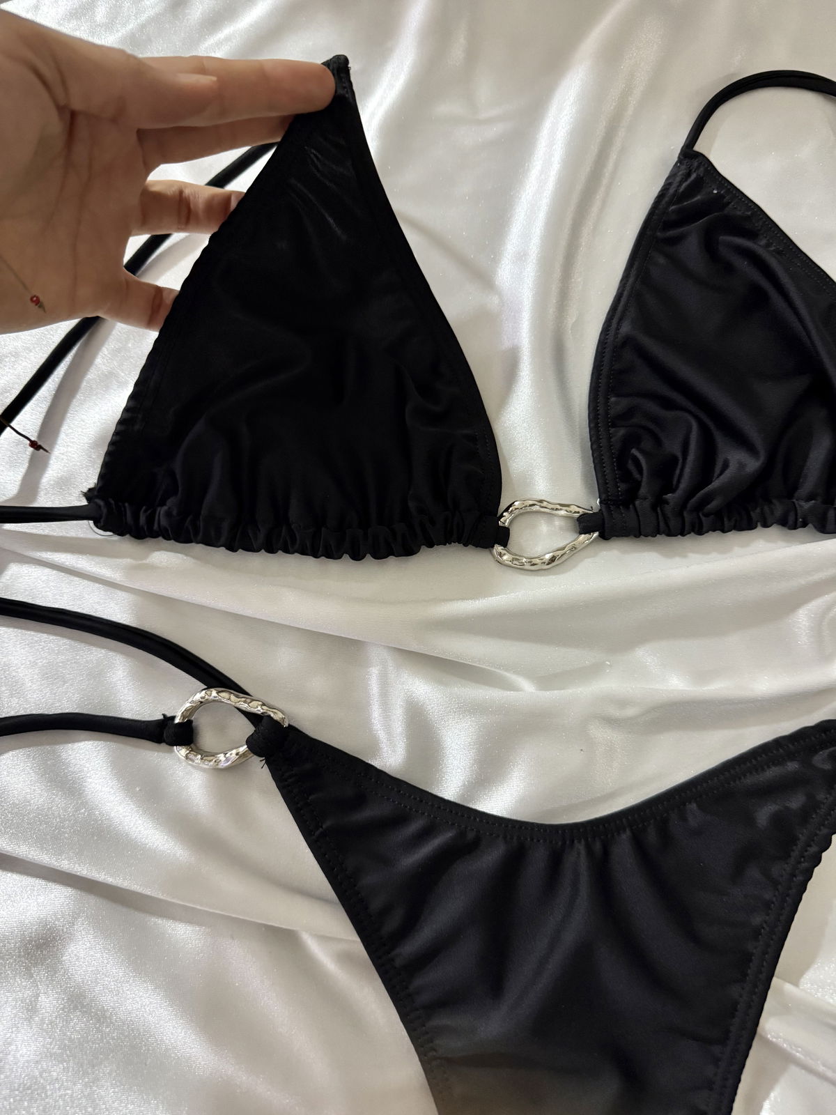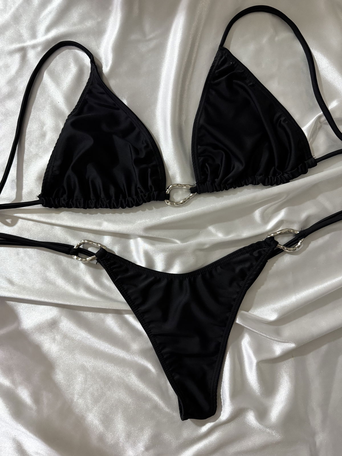 Corpiño tipo triangulo, con tiras para atar y avio irregular en centro. Bombacha colaless para atar con avio irregular. Talle 01/85 a 04/100