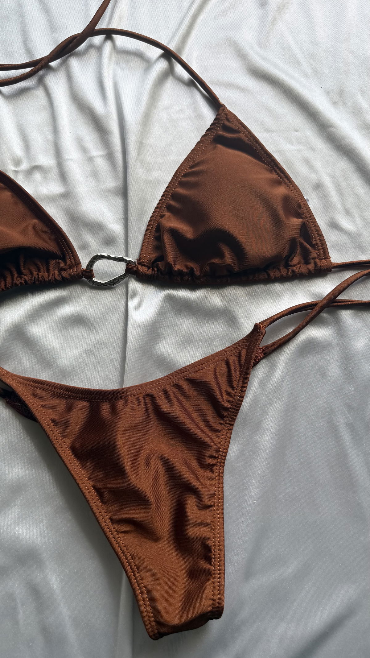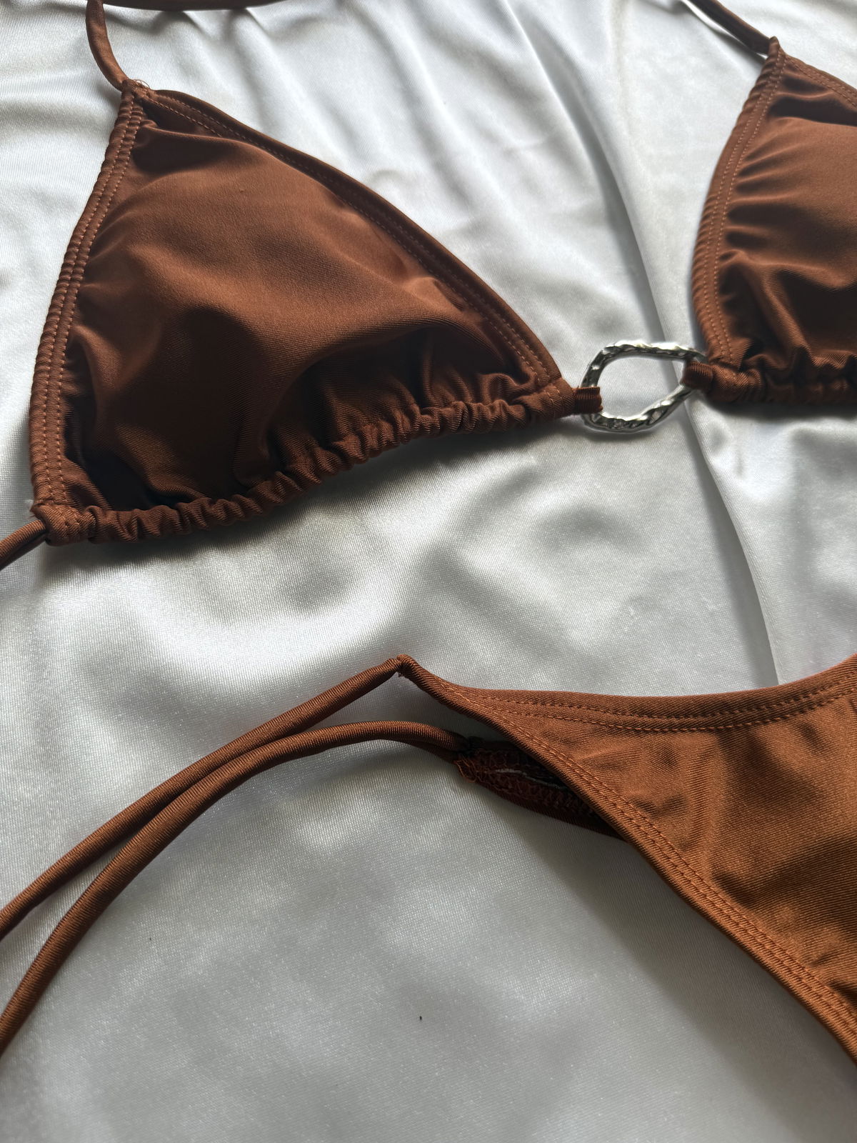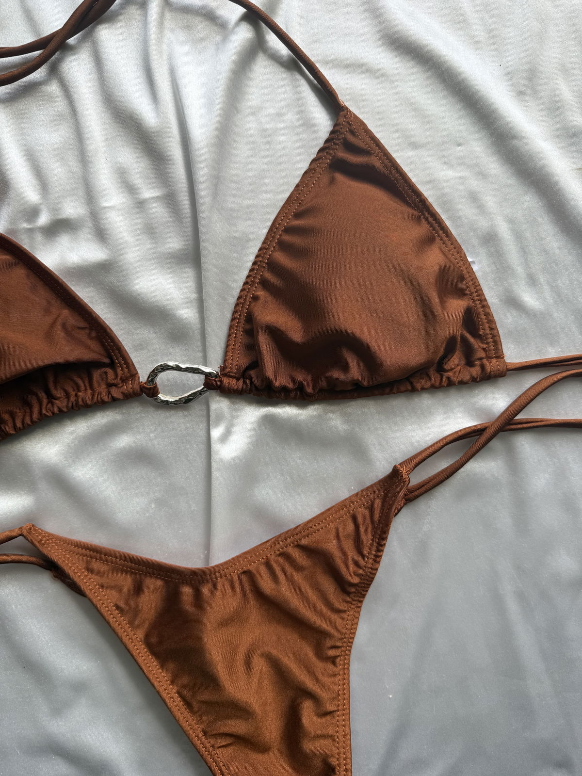 👙 Corpiño triángulo para atar con detalle metálico central. Incluye tasas desmontables