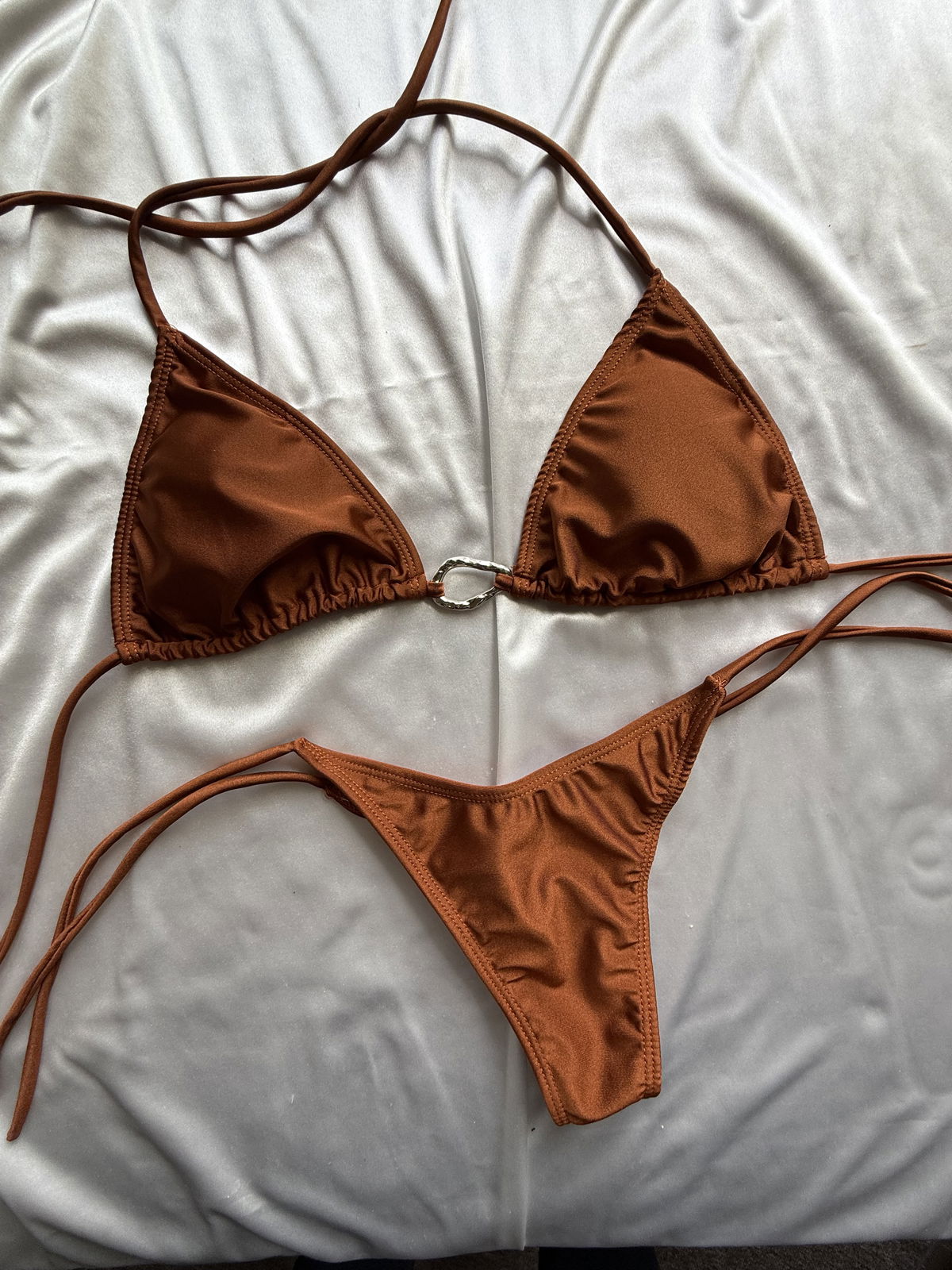 Un clásico con un toque moderno. Este conjunto en tono cobre resalta el bronceado y se adapta perfectamente al cuerpo.