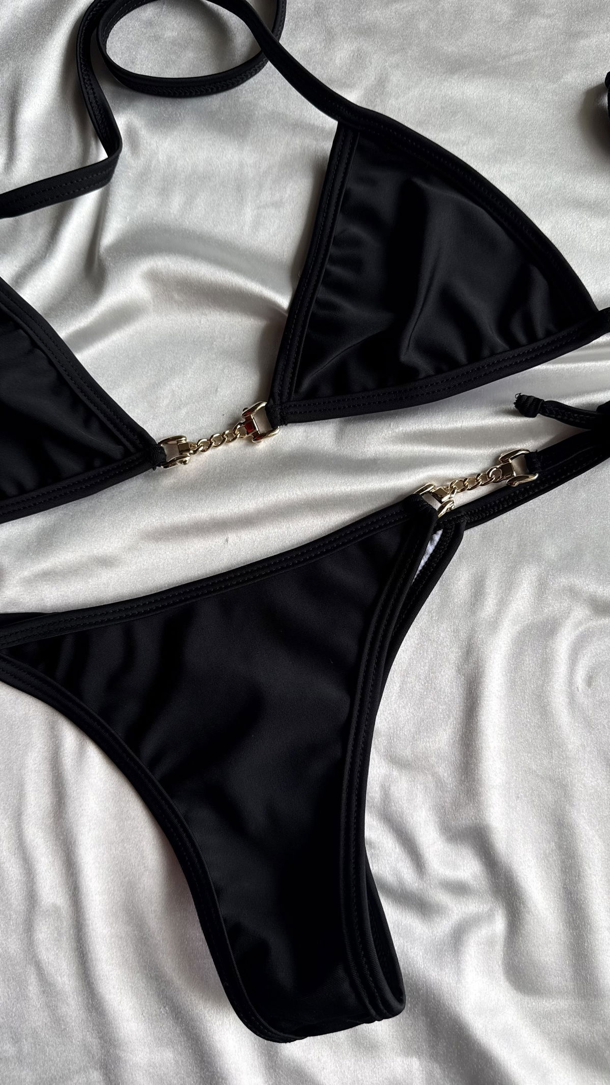 Esta nueva microbikini vino a robarse tu corazón 💘 Set corpi triangulito con detalle dorado y colaless tricot para atar. Es tu nueva favorita, te lo prometo 🤞