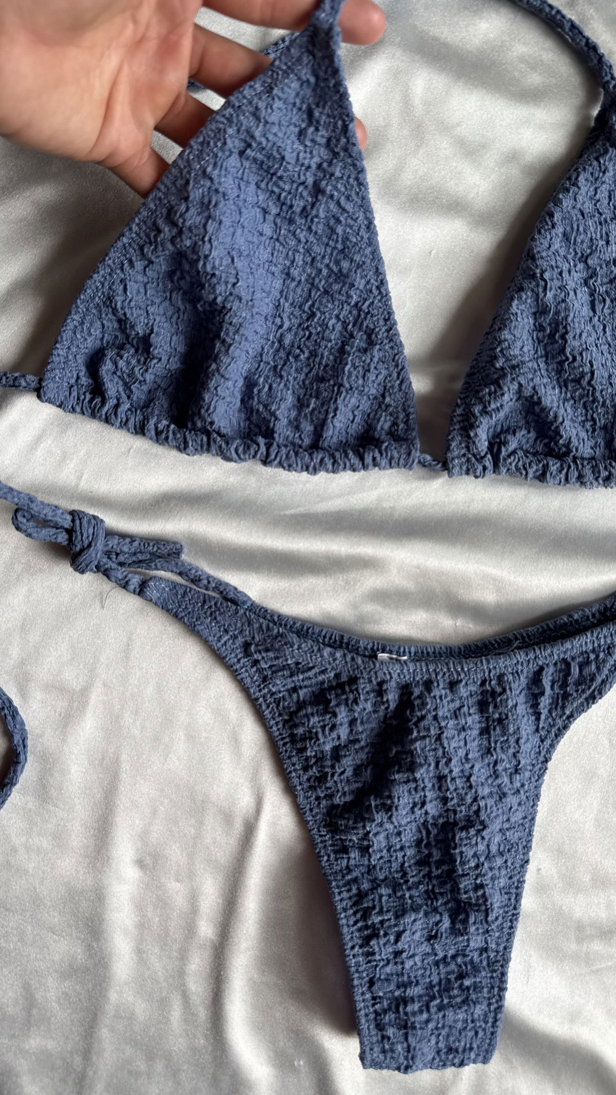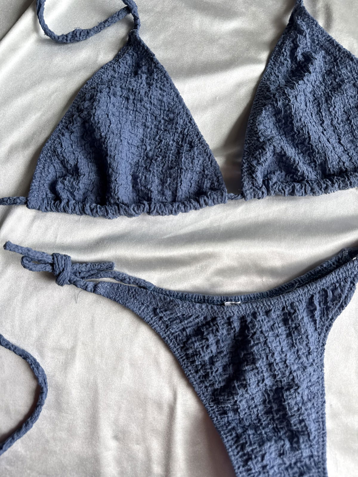 Set bikini triangulito para atar y colaless para atar. Tela texturada. Completamente forrada por dentro