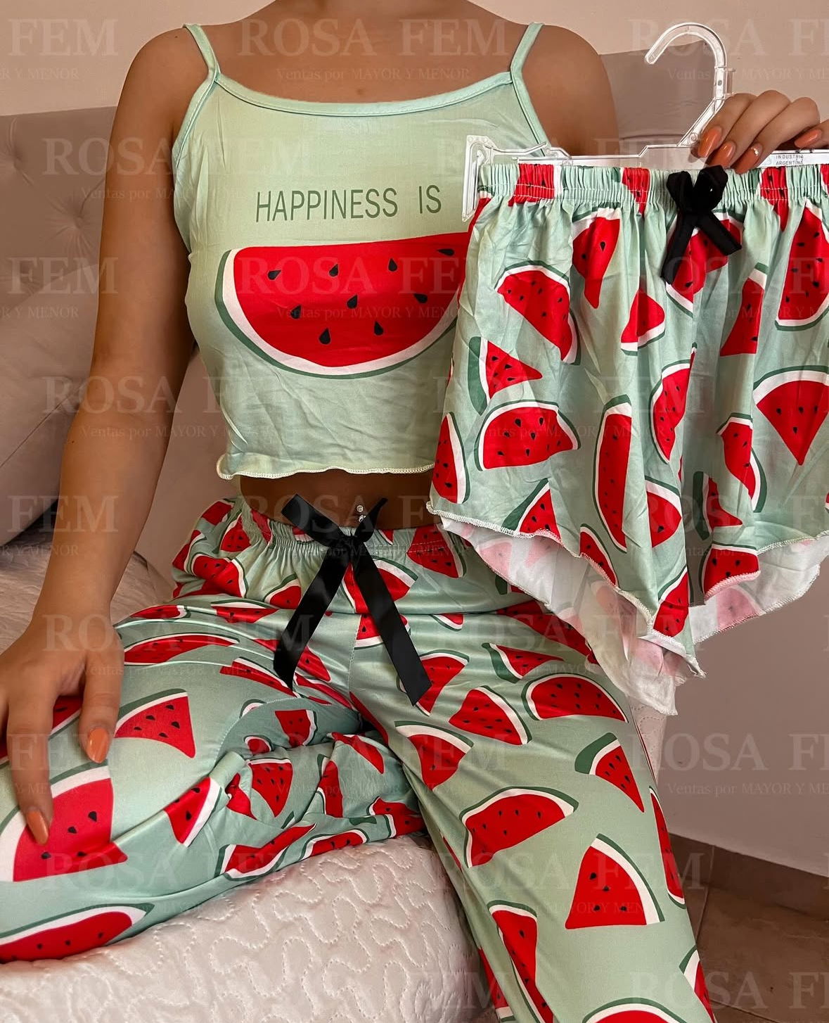 Pijama 3 piezas - short, top y pantalón largo. Talle único, abarca de 36 a 42